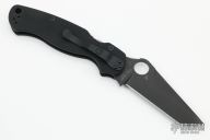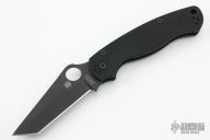 This G81GM4BKP2 Paramilitary 2 by Spyderco features a black tanto blade with thumb hole, notched thumb ramp and choil. The handle is comprised of textured black G10 scales over a stainless steel subframe and lockbar. 4 way adjustable pocket clip and lanyard tube in pommel. Includes original box and paperwork. Excellent condition.