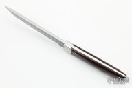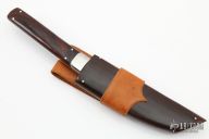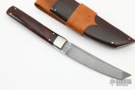 This knife by Jim Lee features a Damascus tanto blade with a full tapered tang construction.  .183" Blade Stock.  .891" Blade Depth.  The handle has stainless steel dovetailed bolsters and wood scales with stainless steel pins. Comes with a wood and leather sheath.  Excellent Condition.