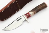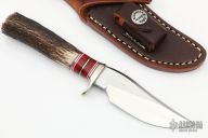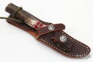 The miniature Model 27 debuted in Randall's 2012 75th anniversary catalog and is the first catalog miniature model. This knife has a 3.5" stainless steel blade, .172" blade stock and 1.024" blade depth, hidden tang construction. The handle has a nickel silver guard and butt, stag grip, and red/duralumin/white/red linen micarta/black/brass spacer pattern. Comes with a brown leather sheath and original paper wrapping. New from maker.