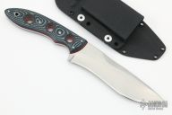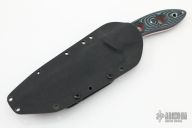 This Fighter by Neil Blackwood features a hand rub satin finished spear point blade with a notched thumb rest and a full tang construction. .156" Blade Stock.  1.35" Blade Depth. The handle features G10 Scales over red liners. Comes with kydex sheath, has edom light scuffs, otherwise Excellent Condition.