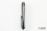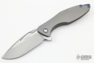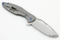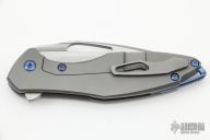 This Arius by Koenig knives features a bead blast finish blade with thumbhole and flipper. The handle has a nicely milled titanium frame with a titanium tip up clip, anodized titanium backspacer. Has ceramic bearings and a ceramic detent ball. Nice detent, lockup and blade seating. Comes with original box and COA 2/12/19. Has some light scuffs and scratches, otherwise good condition.