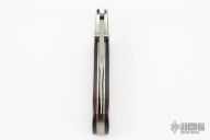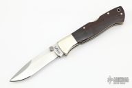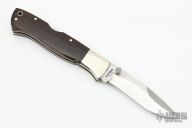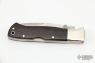 This Mamba Lockback from Blackjack Knives features a recurve blade with dual thumb studs. The handle is comprised nickel silver bolsters, liners, and pins. The handle has wood inlays and a stainless rockerbar. There are scuffs and scratches visible on the blade and handle otherwise the knife is in good working condition.