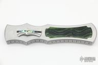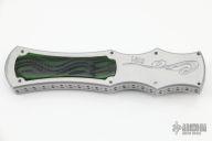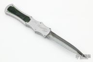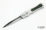 This Burn Custom Razor OTF has a hollow ground double-edged Blued Damascus blade. The chassis is cut from 416SS, has presentation grade Abalone inlay on the push button, blazer engraved accents and jigged bone inlay. Blade deploys with authority and locks up tight with minimal blade play. Comes with zipper case. Has a couple scratches, otherwise excellent condition.