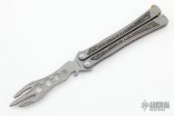 This Balisong is a collaboration between from Maxace & Midnightcat Studios.  This knife features a bead blasted trident style trainer blade. The handle features bead blasted titanium frames with copper powder carbon fiber inlays.  Includes a satin finished double-edged blade, original padded zippered case and a microfiber.  New from maker.