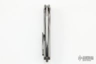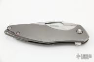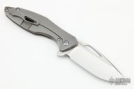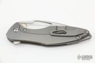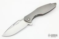 This Arius by Koenig knives features a mirror tumble finish blade with thumbhole and flipper. The handle has a nicely milled titanium frame with a titanium tip up clip, matching titanium backspacer. Has ceramic bearings and a ceramic detent ball. Nice detent, lockup and blade seating. Comes with original box and COA 2/12/2021. Gen4B4. Has scuffs and scratches, and some staining on the blade. Great user condition otherwise.