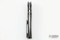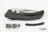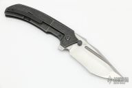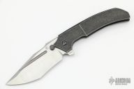 This Satori by Custom Knife Factory is a Peter Rassenti Design, the blade is two-tone finished with notched thumbrest and flipper. The handle has a tumbled titanium frame with tip up black titanium clip, lanyard hole, stainless lock face insert with overtravel stop. Rides on bearings, nice detent, lockup and blade seating. Comes with nylon Velcro case and extra hardware. Excellent condition. #30 on flipper tab.