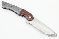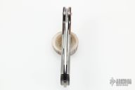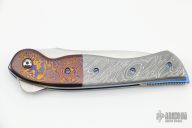 This Custom Flipper by Jim Smyth features a hand rubbed satin finished 154CM blade with notched thumbrest and flipper. The handle has timascus dovetailed bolsters, Damascus scales, notched and anodized titanium backspacer, anodized titanium screws, satin finished titanium liners with blue anodized interiors. Nice detent, lockup and blade seating. Excellent condition. Comes with zippered case.