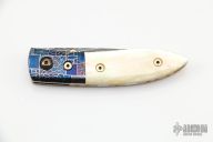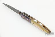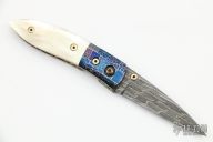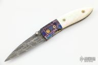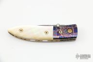 This linerlock folder by Joe Pardue features a Damascus blade with file worked spine and single thumbstud with a gold lip pearl inlay. The handle has dovetailed Mosaic Damascus bolsters, gold lip pearl scales, anodized and jeweled titanium liners, and a fileworked titanium backspacer with mother of pearl inlays. Nice detent, perfect lock up and blade seating. Excellent condition.