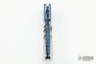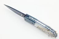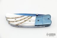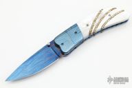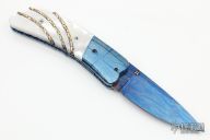 This linerlock by Wayne Whittaker features a blued Damascus blade with single thumbstud. The handle has dovetailed and blued mosaic Damascus bolsters, mother of pearl scales with twisted wire inlays, fileworked and anodized titanium liners, fileworked stainless steel backspacer with mother of pearl inlay. Nice detent and lockup. Excellent condition.