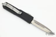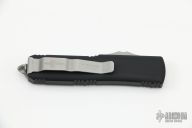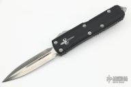 This UTX-85 OTF automatic by Marfione custom knives features a D/E mirror polish stonewash double-edged blade with a standard edge, and a black aluminum handle with blasted hardware, tip down carry. Glass breaker. S/N 009. Dated 12/2015. Comes with original box and papers. Excellent condition.