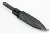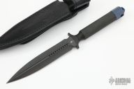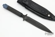 This ADO-L by Marfione Custom Knives is made from a single steel billet. Hand Ground! Distressed black ceramic coated double edge blade with knurled handle. Blade is .247" thick and 1.028" deep. Removable anodized titanium butt cap with storage area inside the handle. Leather sheath with belt clip. Excellent condition.