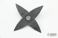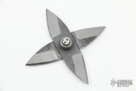 This Folding 4-Point Shuriken by Blossom Blade features bead blasted chisel ground blades that pivot and lock open. Push the button and pivot them back to fit them in the black leather sheath with belt clip. Has some light scuffs, otherwise excellent condition.