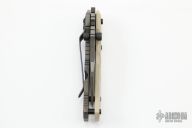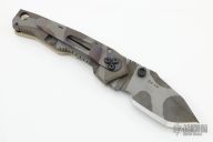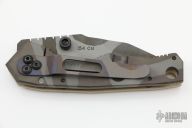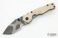 This Model 7 TripWire by the Late Dwaine Carrillo features a bead blast and striped blade with dual thumbstuds and notched thumbrest. Tan G-10 and striped titanium frame and pocket clip for tip down carry. Strong lock up, nice detent and blade seating is center. Excellent condition. Comes with a Maxpedition zippered case.
