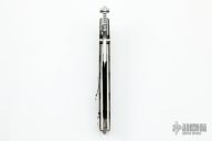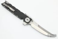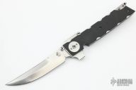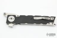 This Linerlock Flipper by Mike Franklin features a satin finished blade with sharpened top edge, notched thumbrest, flipper and dual thumbstuds. The handle has carbon fiber scales, jeweled titanium liners, stainless steel backspacer with lanyard hole, tip up jeweled titanium clip. Nice detent, and lock and blade seating. Has some light scratches, otherwise excellent condition.