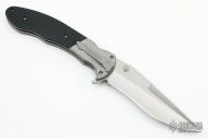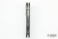 This Monster flipper by Brad Duncan features a satin finished blade with dual thumbstuds and false top edge. It has a bead blast titanium frame, silver twill bolsters and g10 scales. Bead blast stainless steel tip down clip. Smooth and fast flipper opening that requires no wrist action. Nice detent, and blade seating. Has some blade wobble. More vertical than horizontal. Has some scuffs and scratches on the frame, otherwise good condition.