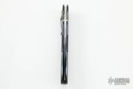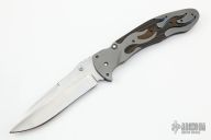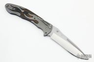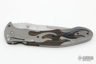This Monster Auto by Brad Duncan features a satin finished blade with dual thumbstuds and false top edge. It has an anodize finish titanium frame, bead blast finish bolsters front and rear with g10 scales. Bead blast stainless steel tip down clip. Smooth and fast flipper opening. Nice detent. Has some horizontal blade play. Blade rubs the frame. Has some scuffs and scratches on the frame, otherwise good condition.