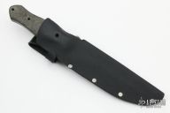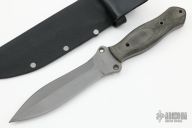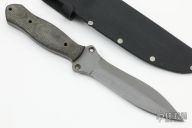 This knife by Dennis Cook features a bead blast finished double edged blade with notched thumb and finger rests, full tang construction with blade thickness of .213" and depth of 1.26". The handle has micarta scales. Comes with kydex sheath. Has a couple light marks, otherwise excellent condition.