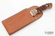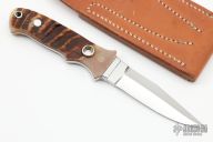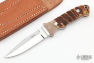 This Loveless Style New York Special by John Young features a mirror polished clip point blade with sharpened top edge, .186" blade stock and .839" blade depth, full tapered tang construction. The handle has mirror polished stainless steel bolsters, sheep horn scales with red liners and mirror polished stainless steel pins and lanyard hole. Comes with a leather sheath with snap to hold knife in place. Excellent condition.