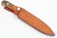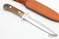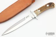 This Dagger by John Young features a mirror finished double-edged blade, .182" blade stock and .932" blade depth, full tapered tang construction. The handle has mirror polished stainless steel guard, sheep horn scales with red liners. Comes with a brown leather sheath. Excellent condition.