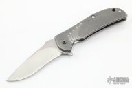 This Modulator framelock flipper by RJ Martin features a tumble finish blade and a grey matter finished titanium frame. Includes roller thrust bearings for smooth and fast flipper opening that requires no wrist action. Nice blade seating, detent, and lockup. Outstanding workmanship. Comes with a padded zippered case. Has a few scratches, otherwise excellent condition.