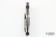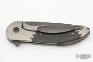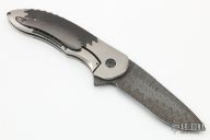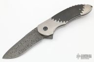 This Chaingang by Daniel Galloway features a Damascus drop point blade with a notched flipper tab.  The handle features an orange peel finished titanium frame with carbon fiber inlays, a zirconium backsapcer and a matching tip up pocket clip.  Nice detent, lock up and blade seating.  Includes a padded case.  Excellent Condition.