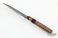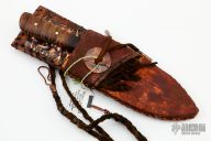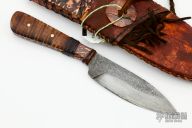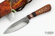 This Frontier Neck Knife by Josh Blount features a hand forged blade with forge finished flats and an antique patina finish overall, .147" blade stock and 1.051" blade depth, full tang construction. The handle has curly maple scales with copper and rawhide accents, fileworked tang. Comes with a rawhide sheath with copper accents and a detachable neck lanyard. New from maker.