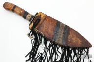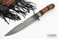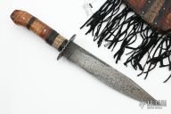 This Frontier Bowie by Josh Blount features a hand forged blade with forge finished flats and an antique patina finish overall, fileworked spine .259" blade stock and 1.481" blade depth, full tang construction. The handle has a fileworked mild steel guard, curly maple grip with whitetail antler, rattlesnake and rawhide accents, fileworked tang. Comes with a rawhide sheath with maple and stag accents. New from maker.