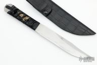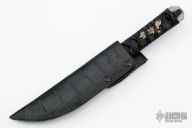This knife by ITAC features a hand rub satin finished blade with nice hamon, .223" blade stock and 1.129" blade depth, full tang construction with leather wrapped handle over leather and nickel silver menuki. Comes with a leather covered kydex sheath and zippered case. Excellent condition.