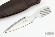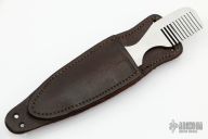 This "Wild Hair" comb dagger features a chisel grind double edged blade. The handle is a comb. In the sheath it appears to be just a comb. Brown leather sheath. Excellent condition.