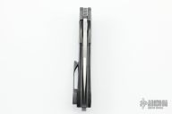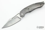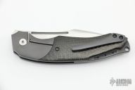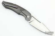 This Jungle by Thierry Savidan features a hand rub satin finished blade with notched thumbrest and front flipper. The handle has a nicely contoured titanium frame with carbon fiber overlays, anodized titanium backspacer with ceramic ball inlays, matching tip up clip. Rides on bearings, nice detent, lockup and blade seating. Has some light scratches, otherwise excellent condition. Comes with a zippered case.