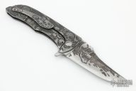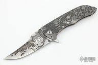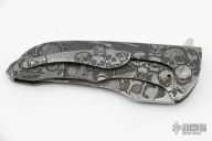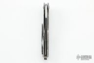 This Splitter by John Gray Knives features a laser engraved blade with fullers and flipper. The handle is comprised of a heavy orange peel finish titanium and laser engraved frame over an orange peel finished titanium backspacer. Matching tip up clip. Includes a zippered case. Great blade seating, detent and lock up. Excellent condition.