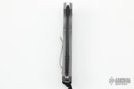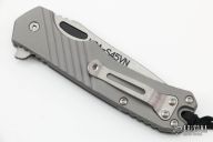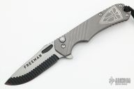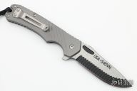 This knife by Freeman Outdoor Gear features a two-tone milled S45VN blade with notched thumbrest and flipper. The handle has a milled and blasted titanium frame with matching tip up clip. Rides on bearings, nice detent, lockup and blade seating. Comes with original box and papers. Has a couple of light scuffs otherwise Excellent condition.