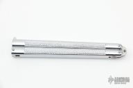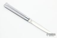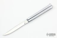 This Vintage Balisong by Valor has a mirror finished blade. The handle features a stainless steel frame. Light scratches on the blade, otherwise excellent condition. Flips nicely.