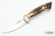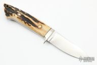 The Semi-Skinner by Bob Loveless features a mirror finished clip point blade with the "R.W. Loveless maker" Lawndale, California logo. Full tapered tang construction. .185" Blade Stock 1.033" Blade Depth. The handle has a nickel silver guard and stag scales with black liners, lanyard hole. #S-227. Has a couple of light scratches, otherwise excellent condition. Really nice stag on this one!