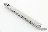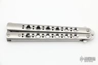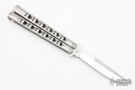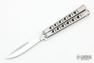 This Model 42 Balisong by Benchmade features a satin finished blade with swedge. The handle is comprised of integral skeletonized titanium handles with latch on pommel. Comes with nylon sheath. Has a couple light scratches, otherwise excellent condition.