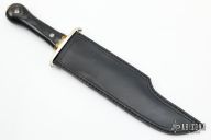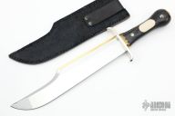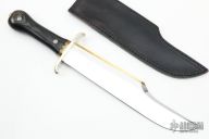 This Iron Mistress by Steve Voorhis features a high polish clip point blade with false top edge and brass parry guard on the blade spine, .229" blade stock, 2.157" blade depth. Hidden tang construction with nickel silver guard and fileworked brass butt, fileworked pins and an ivory paper micarta escutcheon, laminated wood grip. Comes with a black leather sheath. Excellent condition. Has a few very fine scratches.