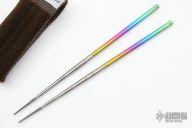 Feed yourself and your pride of ownership with these exquisitely crafted titanium chopsticks. Designed and engineered by world-renowned custom knifemaker Alan Folts and manufactured under the Foltsum™ brand, these chopsticks are beautifully crafted from solid 6AL 4V titanium stock. Their two-piece construction allows them to be conveniently carried when not in use, yet assembled in seconds thanks to a precision threaded joint. Machined in painstaking detail, they feature three different surface finishes, including a bead blasted area near the tip for a secure grip on food, a satin-finished center section, and a rich color-anodized handle section. Machined accents at the top and center add both a touch of style and a thoughtful grip texture that complements their perfect balance.Remarkably strong and lightweight, these elite eating utensils are also 100% corrosion resistant, completely food safe, hypoallergenic, and easily cleaned with ordinary soap and water. They come complete with a ballistic nylon carry pouch with dedicated pockets for all four pieces and a heavy-duty Velcro® closure.