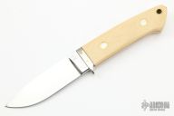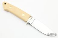 This Loveless Style drop point hunter by WC Davis features a mirror polished drop point blade, nickel silver fittings, and ivory paper micarta scales with red liners, .207" blade thickness and 1.057" blade depth, full tapered tang. Excellent condition.