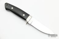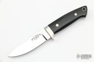 This Loveless Style Miniature Semi-Skinner by WC Davis features a mirror polished drop point blade, nickel silver fittings, and black linen micarta scales, .128" blade thickness and .711" blade depth, full tapered tang. Excellent condition.