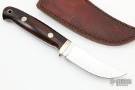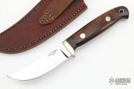 This Skinner by WC Davis features a mirror finished blade, nickel silver fittings, and cocobolo scales, .174" blade thickness and .965" blade depth, full tapered tang construction. Comes with a brown leather sheath. Excellent condition.