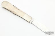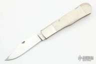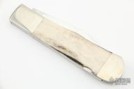This lockback folder by WC Davis features a mirror finished blade with nail nick. The handle has a nickel silver frame with dovetailed bolsters that are integral with the liners, polished stag scales, stainless steel lockbar and black linen micarta backspacer. Nice lockup and blade seating. Has a few light scratches, otherwise excellent condition.