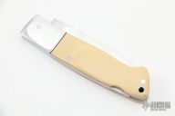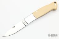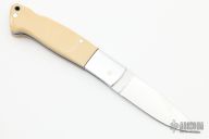 This lockback folder by WC Davis features a mirror finished blade with nail nick. The handle has an aluminum frame with dovetailed bolsters that are integral with the liners, ivory paper micarta scales with red liners, stainless steel lockbar and black linen micarta backspacer. Nice lockup and blade seating. Excellent condition.