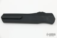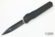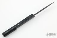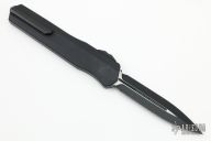 This Cypher OTF is a collaboration between Anthony Marfione and DC Monroe. It features a black double edged blade with satin flats and standard edges. The handle has a black anodized aluminum handle with silver hardware, and a titanium tip down clip and a titanium insert at the butt. Comes with original box and papers. Has some scuffs, otherwise excellent condition. 03/2018 and #1451.