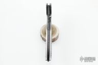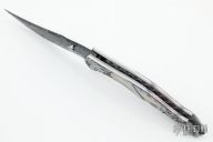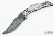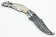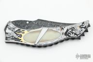 This Ancient Evil by Jody Muller features a Mosaic Damascus blade with a single fileworked thumbstud. Damascus made by Jody Muller. The handle has engraved stainless steel scales with walrus ivory inlays, has gold and copper inlaid engraving done by Jody Muler, anodized titanium liners, blacken steel backspacer. Nice detent and blade seating. Comes with a zippered case. Has a little vertical blade play, otherwise excellent condition.