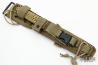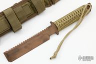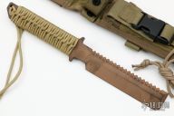 This ED CuBe EOD Knife by Strider features a copper beryllium blade with serrated spine, .274" blade stock and 1.294" blade depth, full tang construction with tan paracord wrapped handle. Comes with a nylon sheath. Has some scuffs, otherwise excellent condition. This one is stamped "S30V" on the guard, but it is clearly Copper Beryllium.