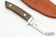This knife by Bob Dozier features a hand ground mirror polished blade, .192" blade stock and 1.056" blade depth, full tapered tang construction. This knife was hand ground and made solely by Bob Dozier. The handle has a stainless steel guard, green canvas micarta scales with red liners. Has lanyard hole at the butt. Comes with a brown leather sheath. Excellent condition.