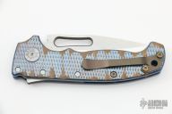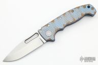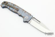 This AD20 by Andrew Demko features a hand hollow ground satin finished blade with notched thumbrest, thumbhole and dual thumbstuds.  The handle has an anodized titanium frame with a tip up anodized titanium clip and "Shark" lock release on the spine. Comes with original box and zippered case. MagnaCut Blade. New from Maker!