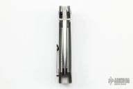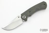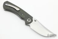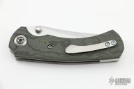 This Hound 3.25 by Melvin Lozada features a hand rub satin finished blade with swedge and dual thumbstuds, .210" blade stock. The handle has Camo Carbon scales with orange peel finished titanium liners and tip up clip, stainless steel backspacer. Nice blade seating, detent and lock up, rides on bearings. Comes with a zippered case and COA. New from maker at the 2022 Blade Show.