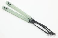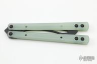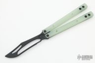 This Trainer balisong by JK Design features a milled, black finish, upswept recurve clip point bade. The handles are comprised of g10 with milled full channel, bronze phosphorus washers and steel bushings. Comes with Zipper case, and makers card. New from Maker.