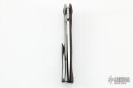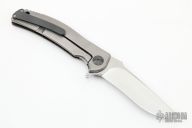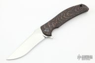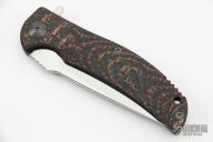 This Q-36 framelock flipper by RJ Martin features a tumble finished Magnacut (RC63) blade with notched thumbrest and a flipper. The handle has a black/copper Fat Carbon and blasted titanium frame and zirconium tip up clip, and a Fat Carbon backspacer. Precision roller thrust bearings give the knife a very fast and smooth opening. Nice blade seating, detent and lockup. Comes with a Velcro case. New from maker at the 2022 Blade Show.